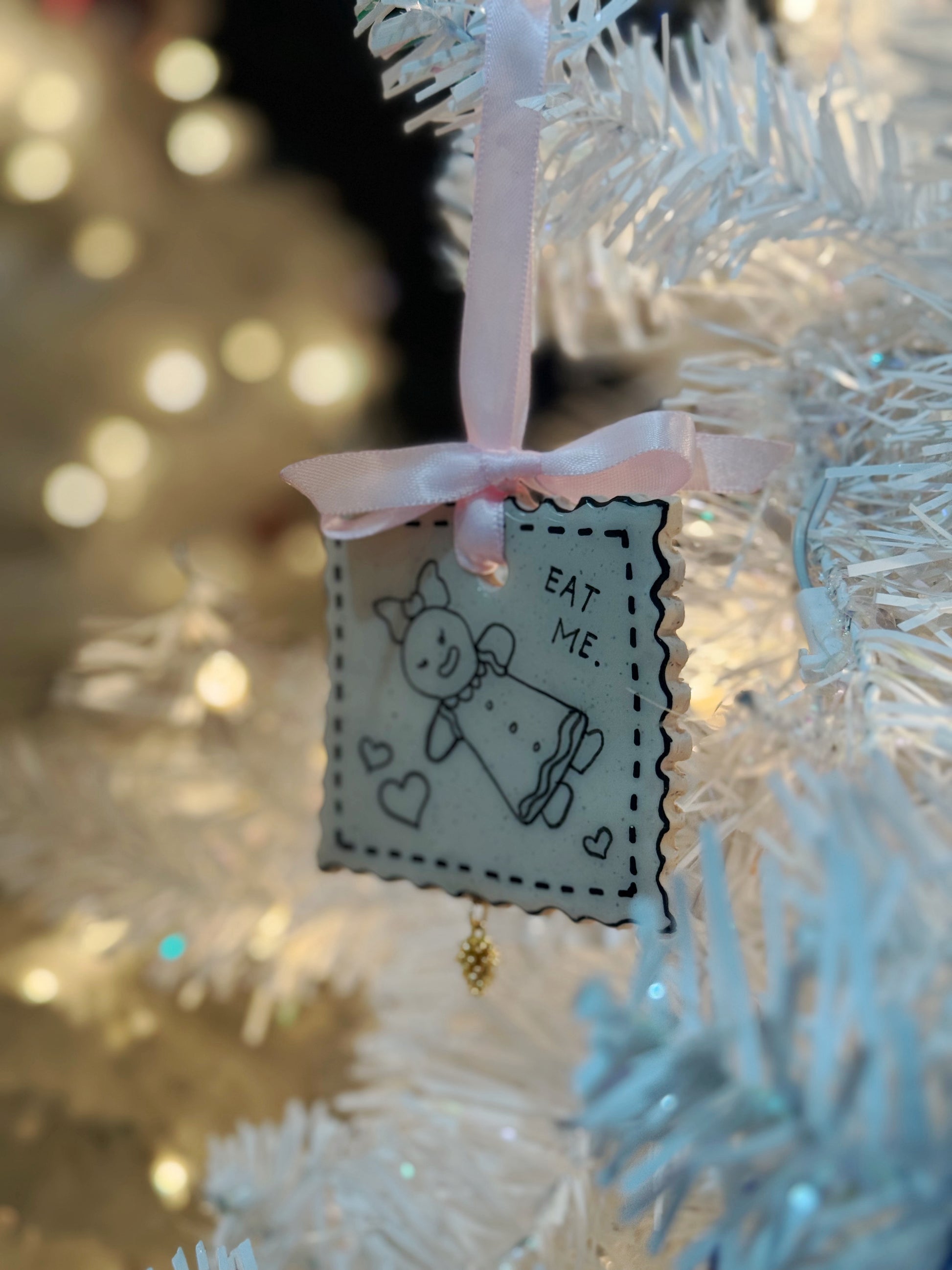 One-of-a-kind, handmade polymer clay Christmas ornaments - created with tons of love, time and care. My original illustrated designs are meticulously hand-painted onto a speckled polymer clay base that has been sculpted and carved to resemble a stamp (as I have an odd affinity to stamp imagery, idk). The pen-painting is encapsulated in a layer of shiny resin to not only showcase the illustration but to keep it protected too! The rest of the clay remains unglazed maintaining its handmade feel & the textural impression of the clay from the MTMELCO branding imprinted on the back (in other words, it feels nice lol). To add that festive touch, the "Eat Me Gingerbread Girl Cookie" ornament is finished with a golden pine cone charm & baby pink satin bow-tie for hanging on your tree.