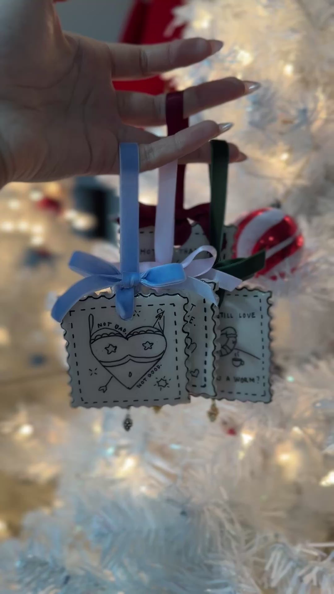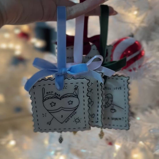 One-of-a-kind, handmade polymer clay Christmas ornaments - created with tons of love, time and care. My original illustrated designs are meticulously hand-painted onto a speckled polymer clay base that has been sculpted and carved to resemble a stamp (as I have an odd affinity to stamp imagery, idk). The pen-painting is encapsulated in a layer of shiny resin to not only showcase the illustration but to keep it protected too! The rest of the clay remains unglazed maintaining its handmade feel & the textural impression of the clay from the MTMELCO branding imprinted on the back (in other words, it feels nice lol). To add that festive touch, the "If I Was a Worm" ornament is finished with a golden pine cone pendant & forest green velvet bow-tie for hanging on your tree.